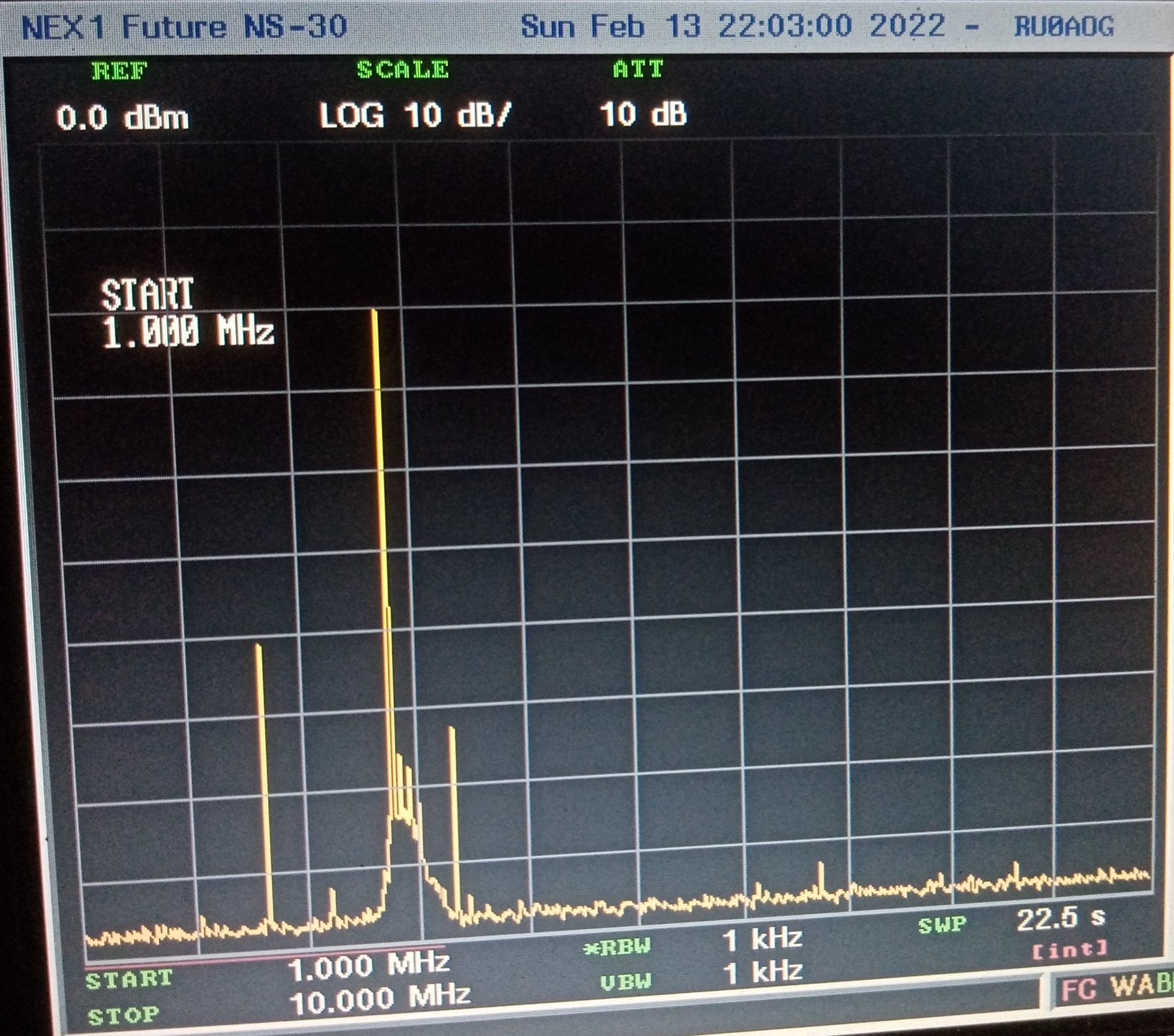 Шумовая полка на -65 dBc около основного сигнала - это по всей видимости то, что прошло через ЭМФ.