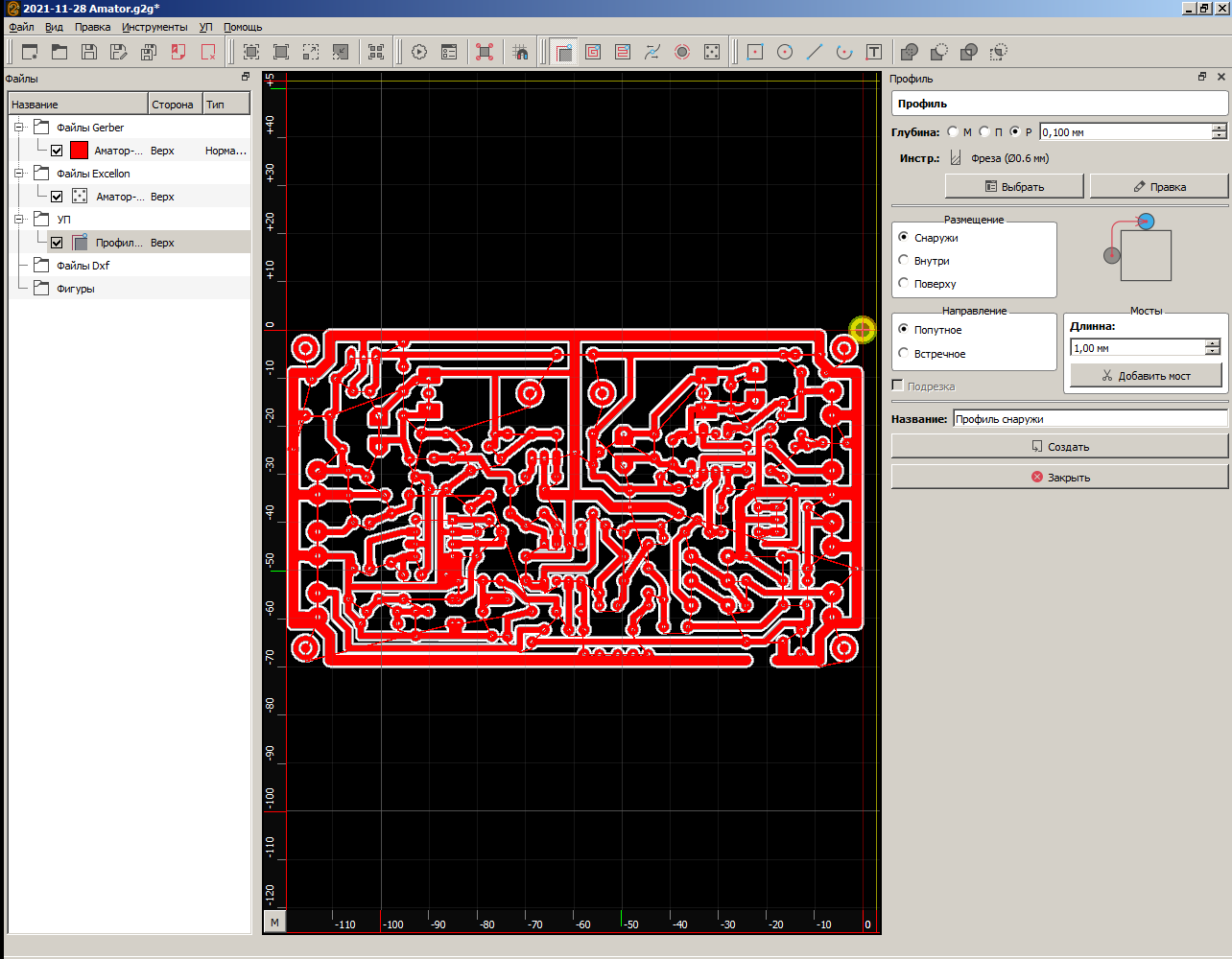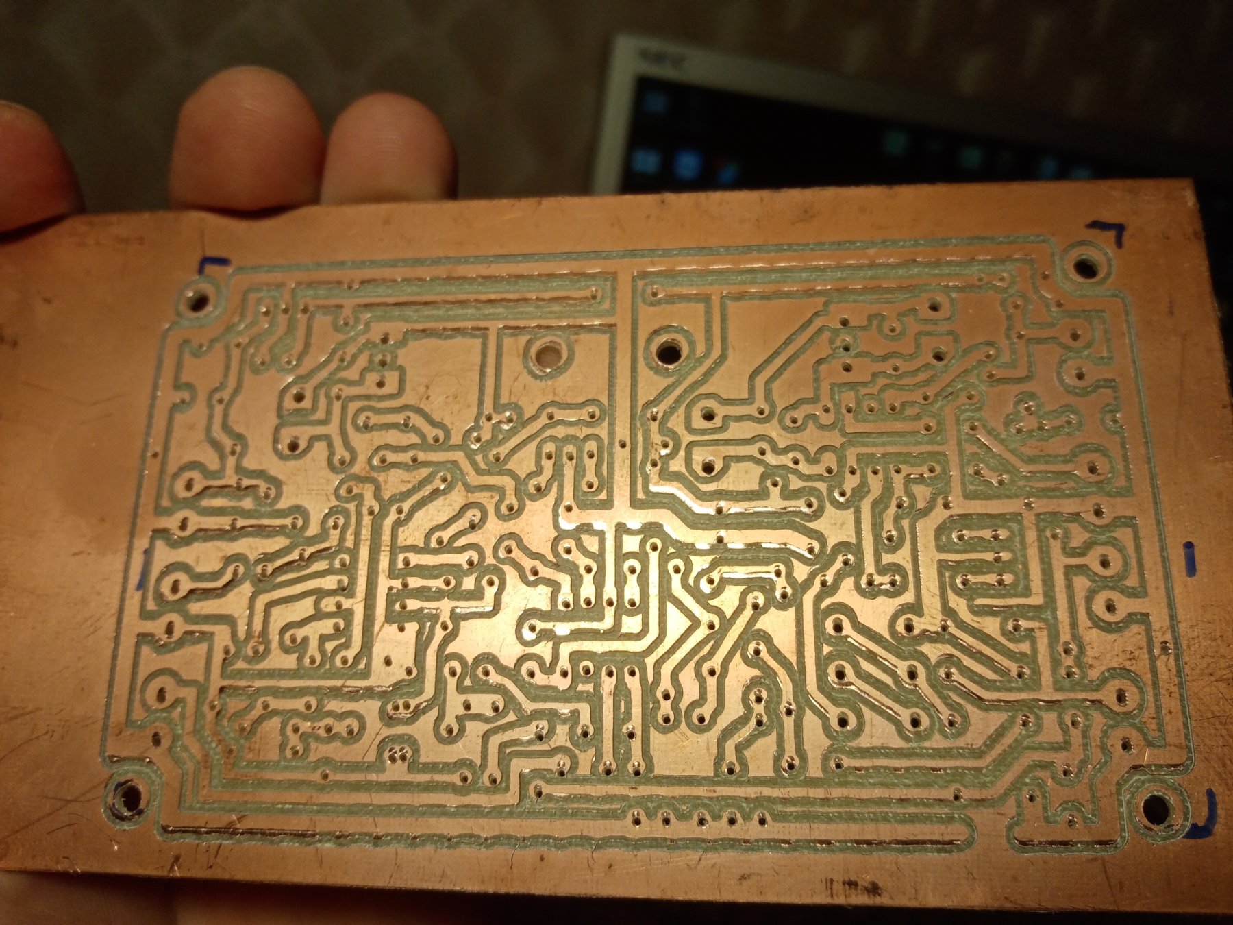 В результате, через полтора часа я получаю вот это Может толщина медной фольги была поболее 0,1 мм, так как на всех участках платы я вижу примерно одинаковый непрорез.