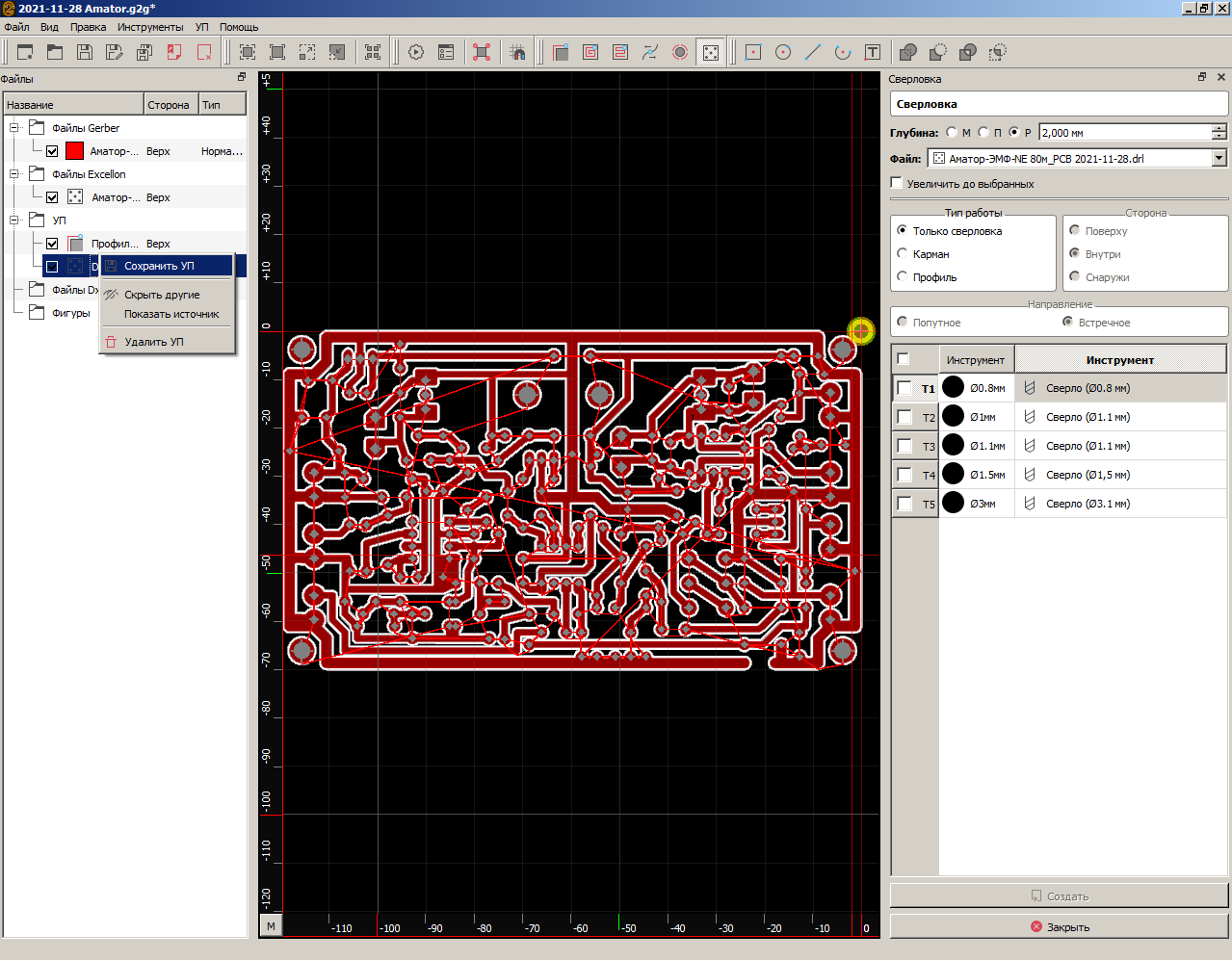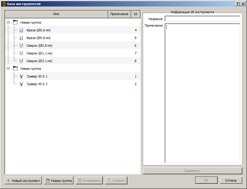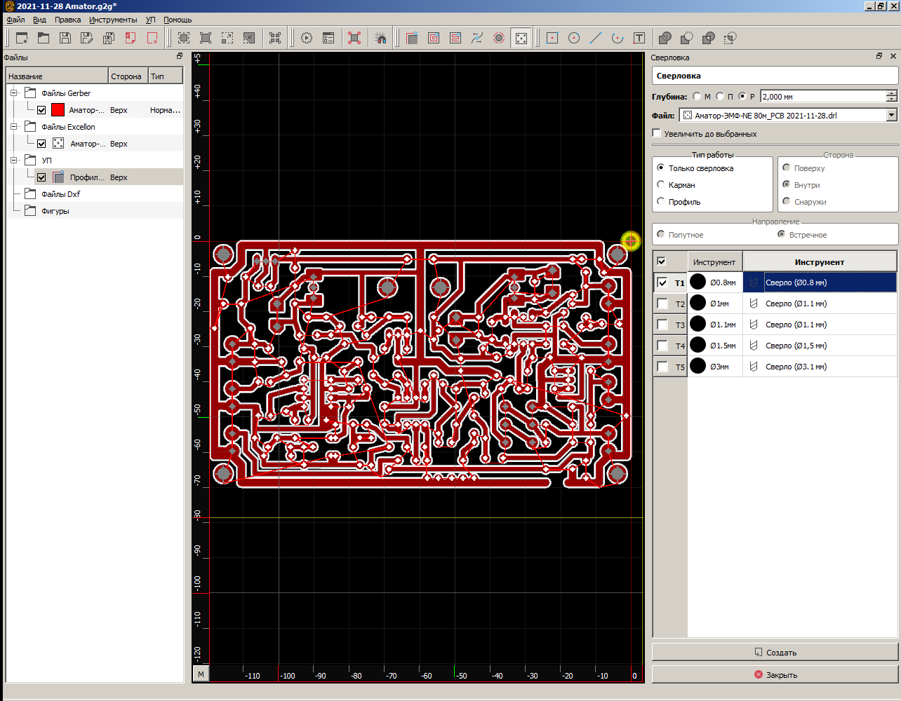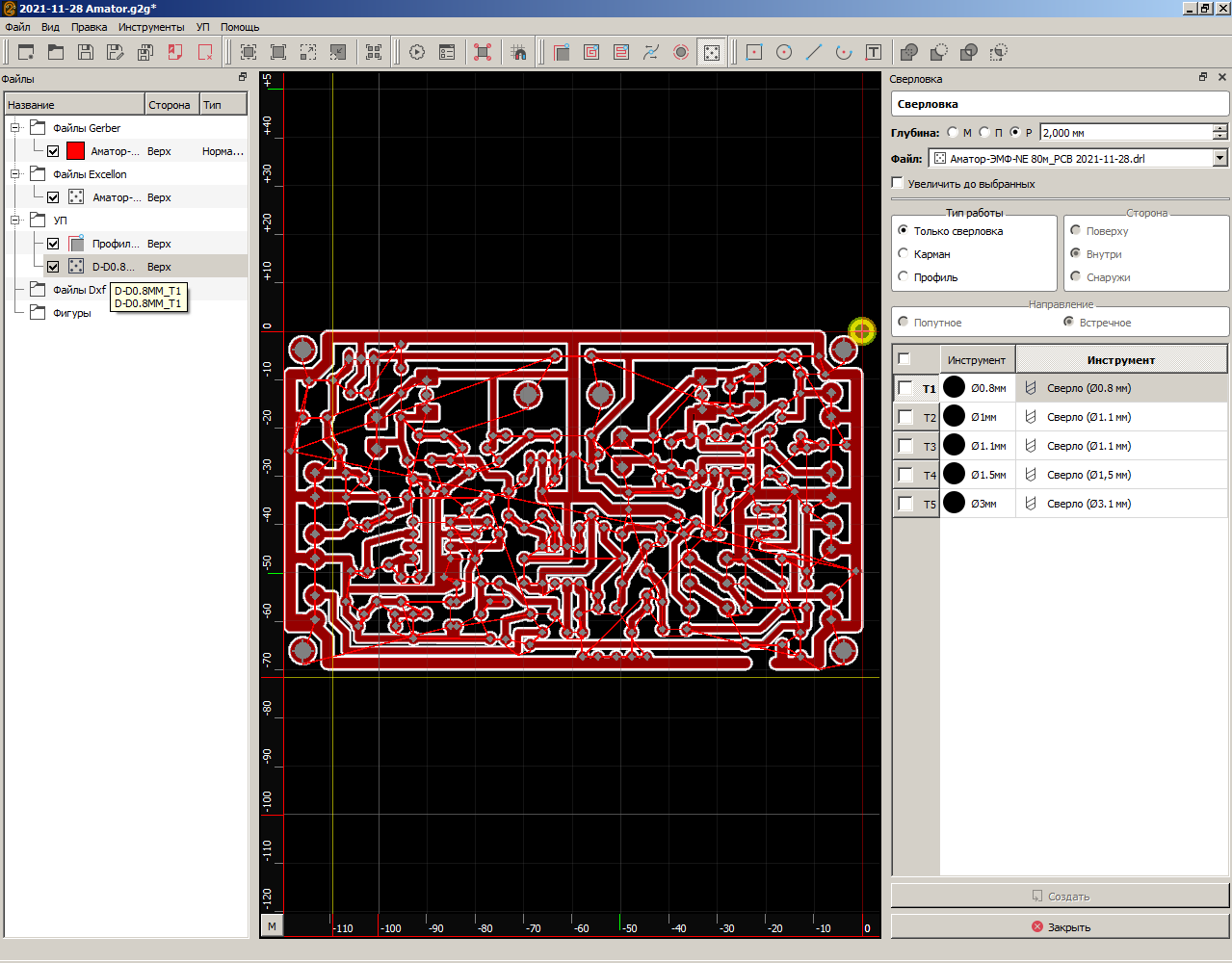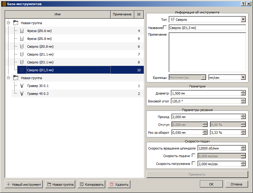 И указать - какие отверстия сверлить каким инструментом Для отверстий 1,5 мм не нашлось инструмента - задаём новый сверло 1,5 мм и указываем параметры работы с этим инструментом - глубина за проход, рез на оборот, число оборотов