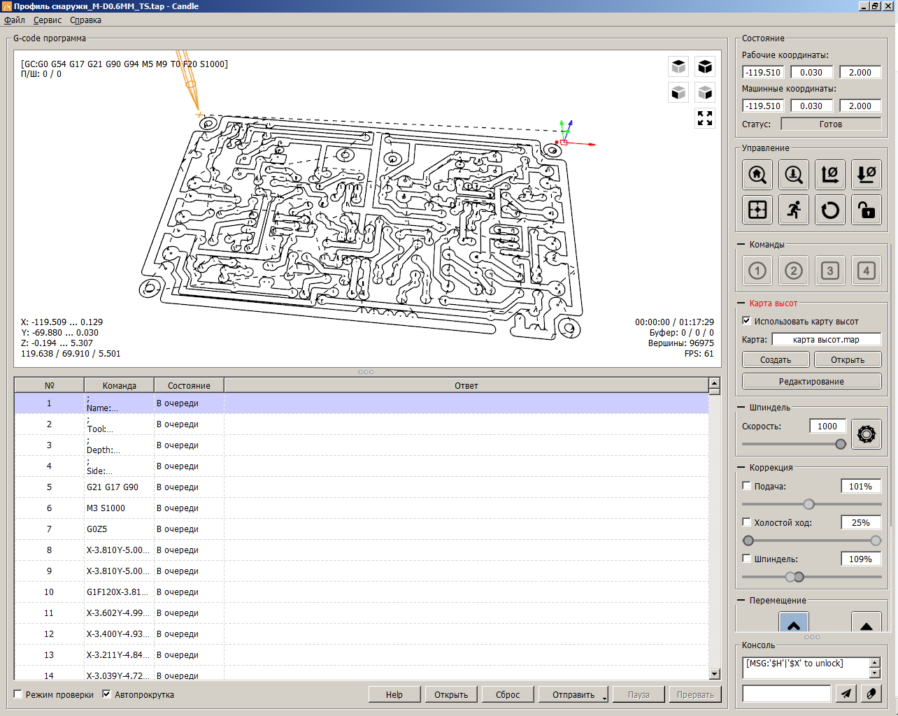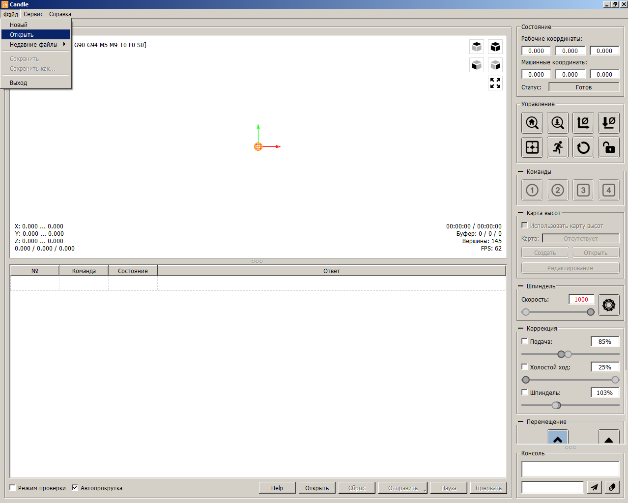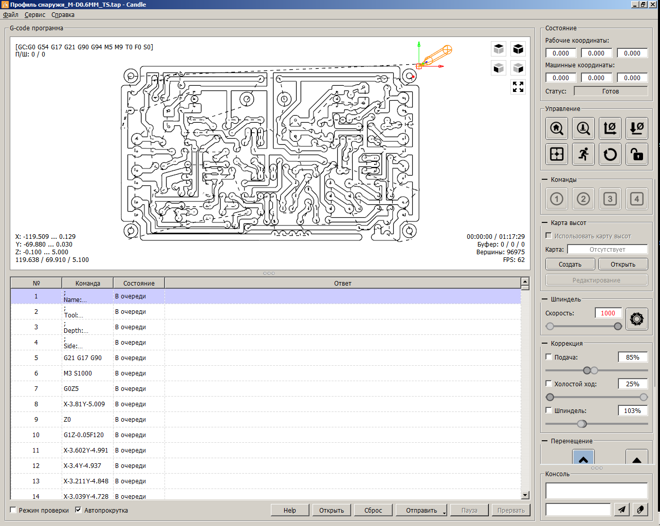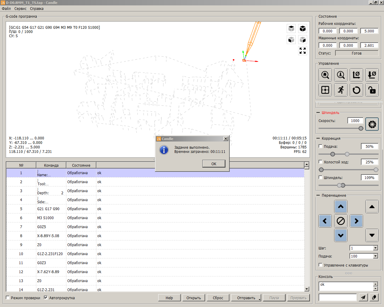и касаемся поверхности (загорелся мой зелёный светодиод) Обнуляем все координаты в программе (можно просто закрыть и запустить Candle заново)