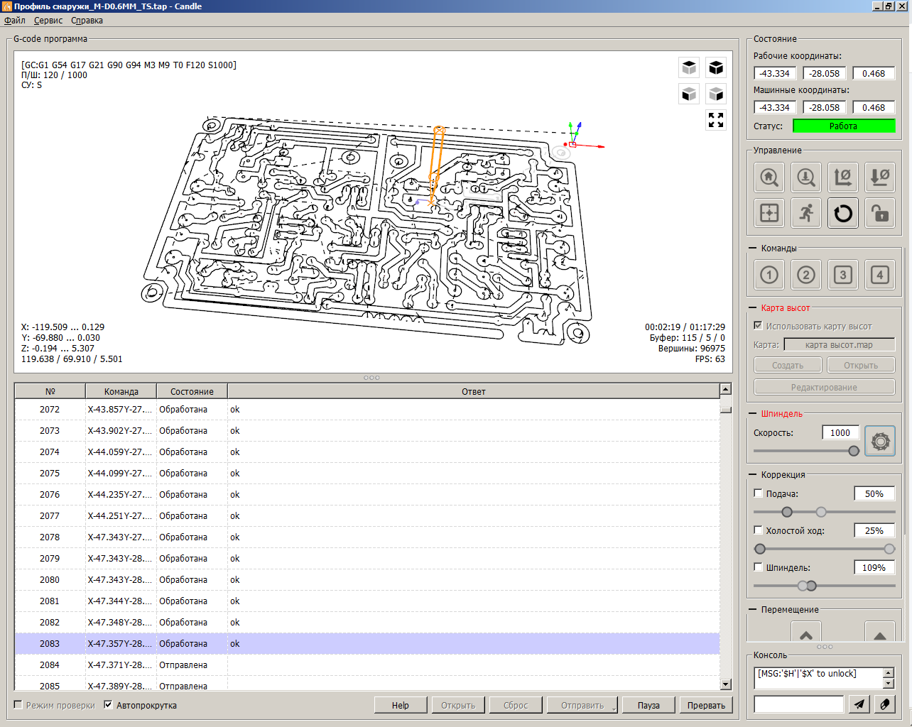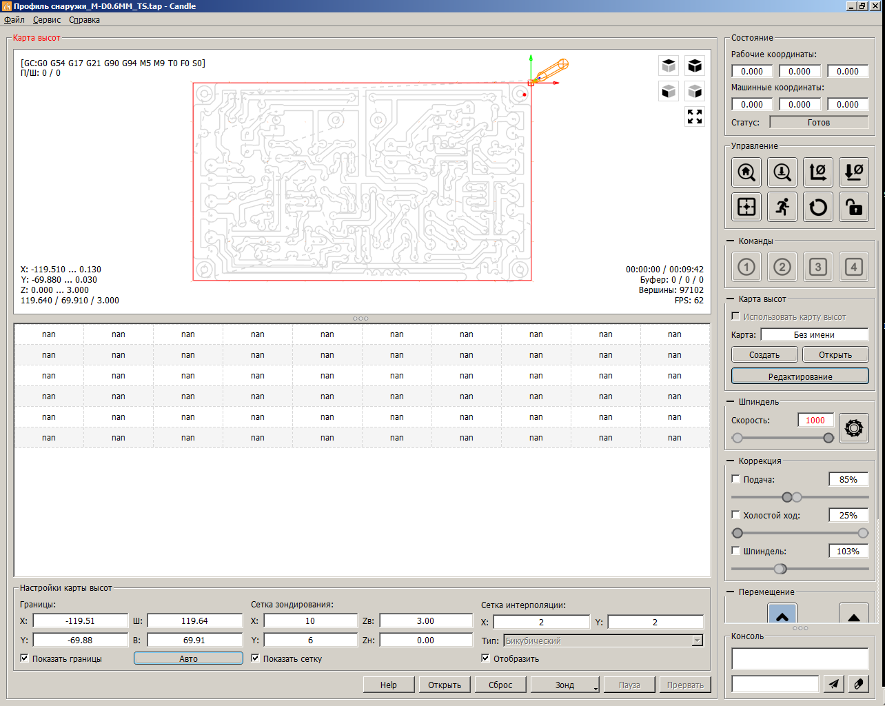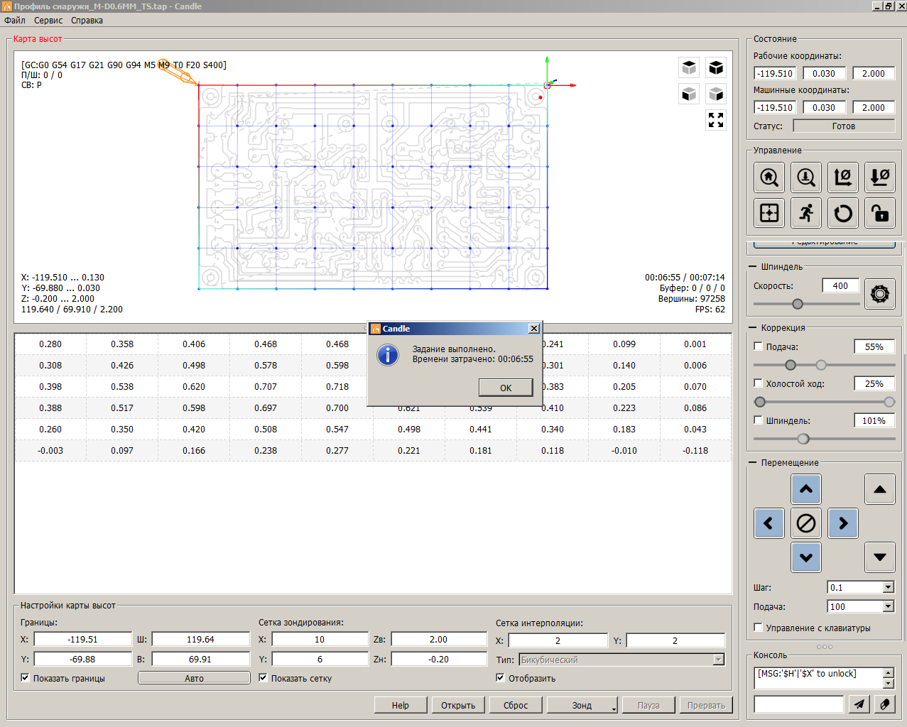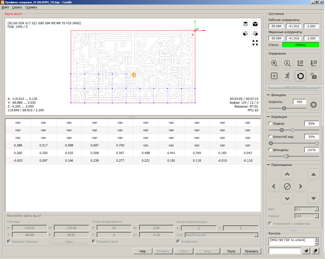 Нажимаем "Зонд" - идёт сканирование Семь минут на такую плату с такой сеткой На всякий случай сохраняем полученную карту высот (расширение map).