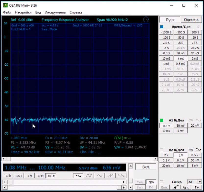 Испытания на тестовом стенде с OSA103mini показали прекрасные результаты: Все равномерно и предсказуемо давится аттенюатором. Но бОльшие ослабления, ОСОй не посмотришь.