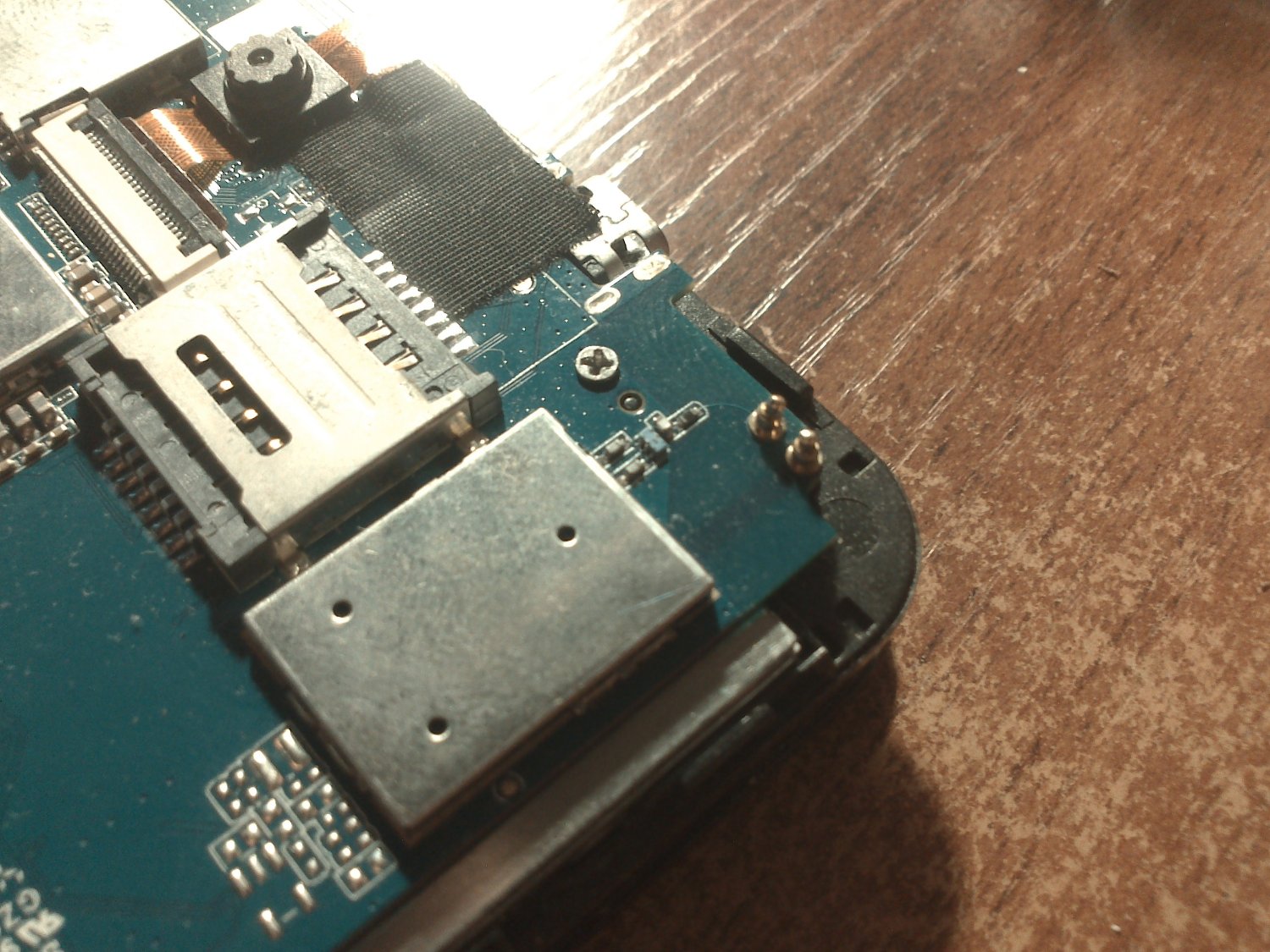 Загадочным образом исчезли с мясом два подпружиненных контакта.Толи после падения на плитку, толи их и раньше не было.Так как планшет собирал из передней рамки, задней крышки и платы