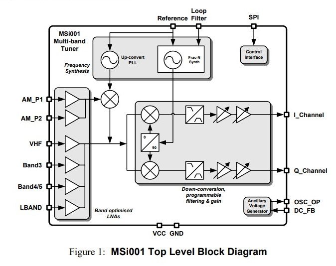 Микросхема msi001 содержит 5 антенных усилителей (каждый на свой диапазон), синтезатор и квадратурные смесители выдающие сигналы I/Q, программно управляемые полосовые фильтры и усилители msi2500 это АЦП с изменяемой разрядностью (от 8 до 14 бит) и ЦСП с USB-интерфейсом В итоге получается: