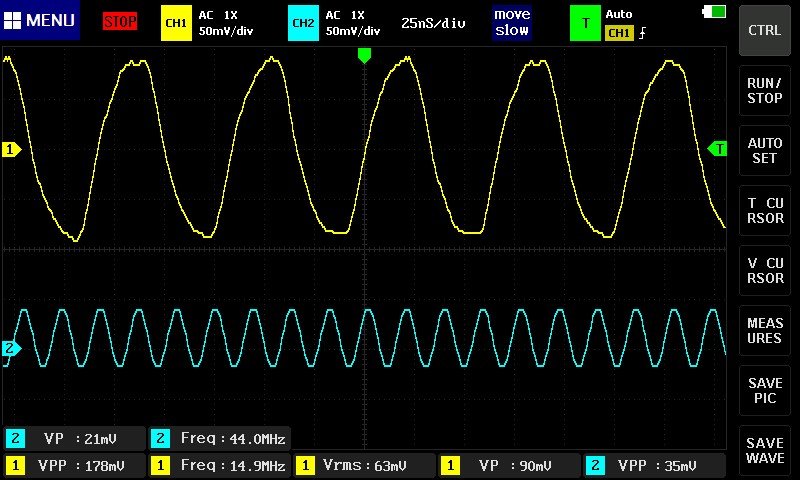 На вход (вместо гпд) подаю сигнал с nanovna 15мгц осцыл показывает синус к базе транзистора Т3 подключаю второй канал и вот что там получаем