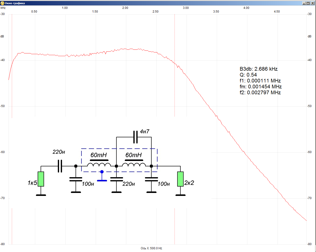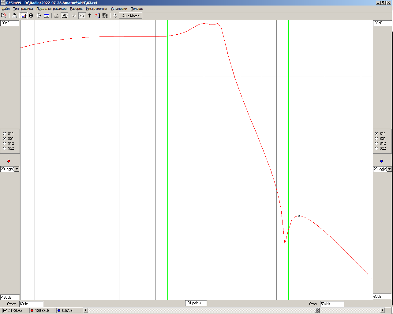 Измеренная Ачх вот такая: Теоретическая АЧХ имеет горб на 90 дБ ниже полосы на частоте 12 кГц. Далее идёт плавное затухание