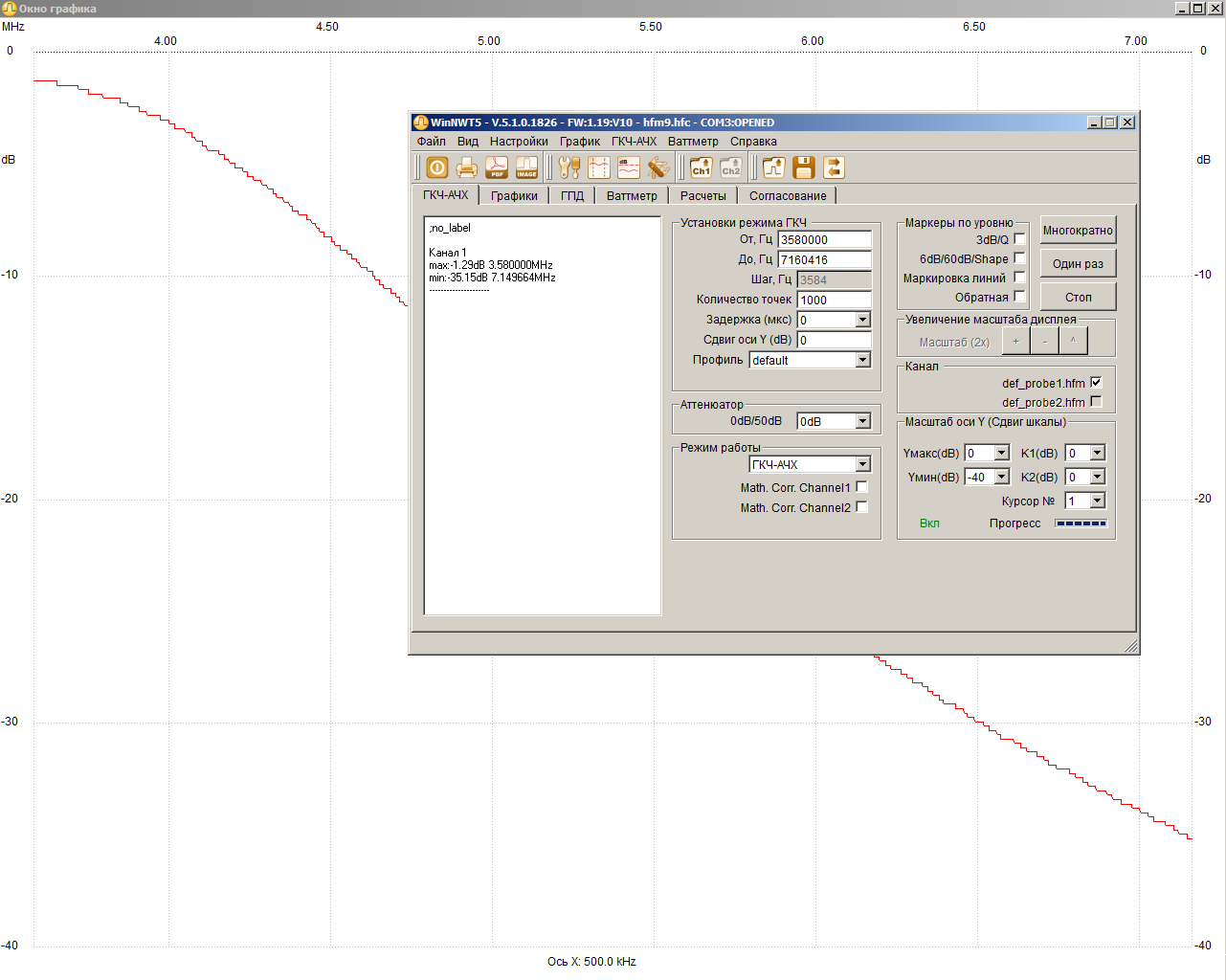 Подстроил сердечники по наилучшей передаче на частоте 3,58 и наилучшему подавлению на 7,17 МГц.