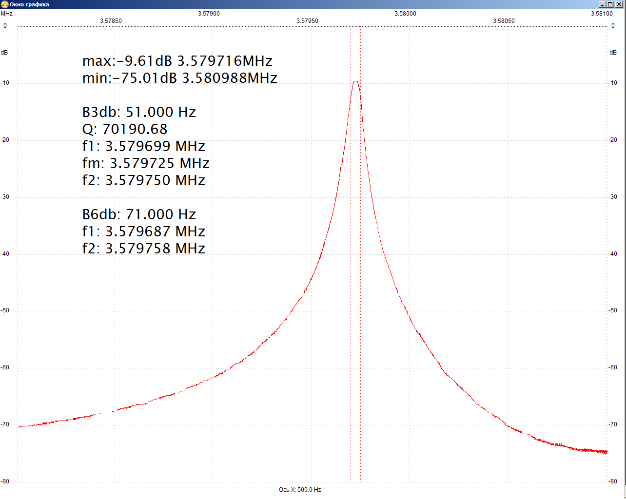 Вывод: фильтр неплохо работает (если учесть, что он не в экране), но имеет приличное затухание из-за высокого сопротивления кварцев.