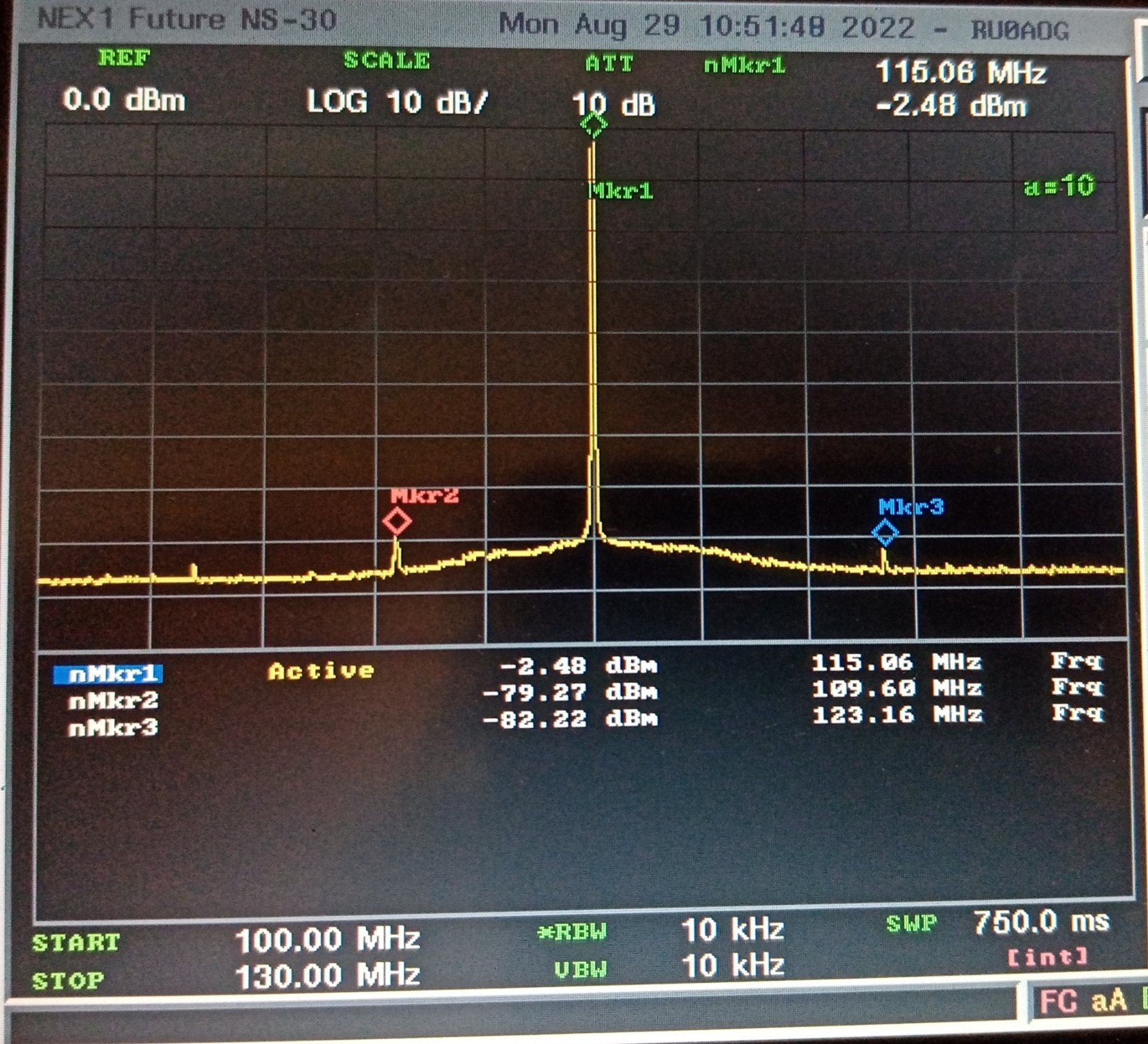 смотрим ближе (на -80 dBc чисто) На 55 МГц опять начинаются спуры отстоят от основного тона на 1 МГц с уровнем -45 dBc если не считать этих палок, основной тон чистый 70 МГц опять разница в 1 МГц 115 МГц и опять +/- 1 МГц