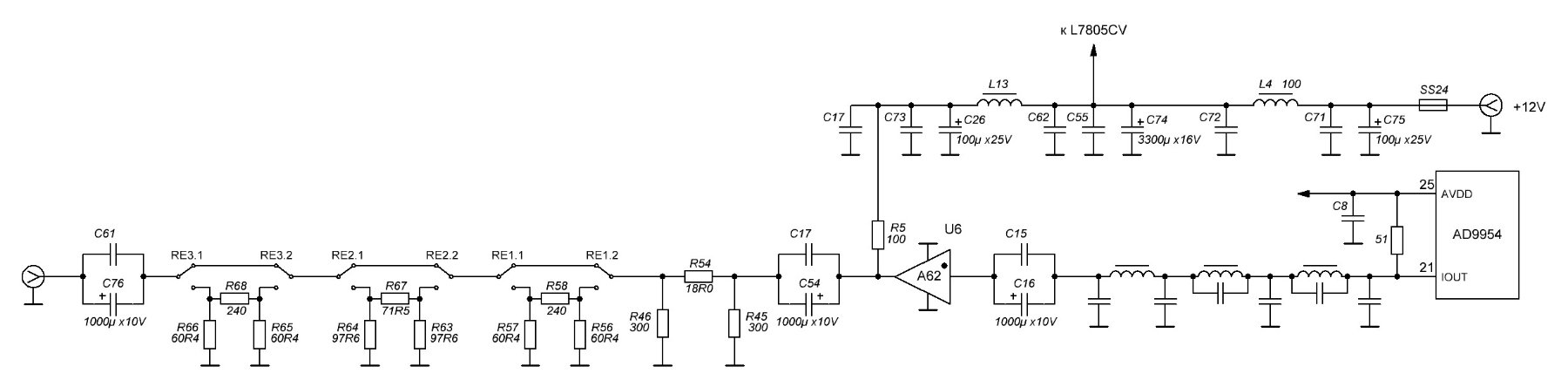 Cправа от U6 всё отлично (от синтеза до усилителя), а вот слева (от усилителя до аттенюаторов и дальше, к выходу) сигнал совсем слабенький.