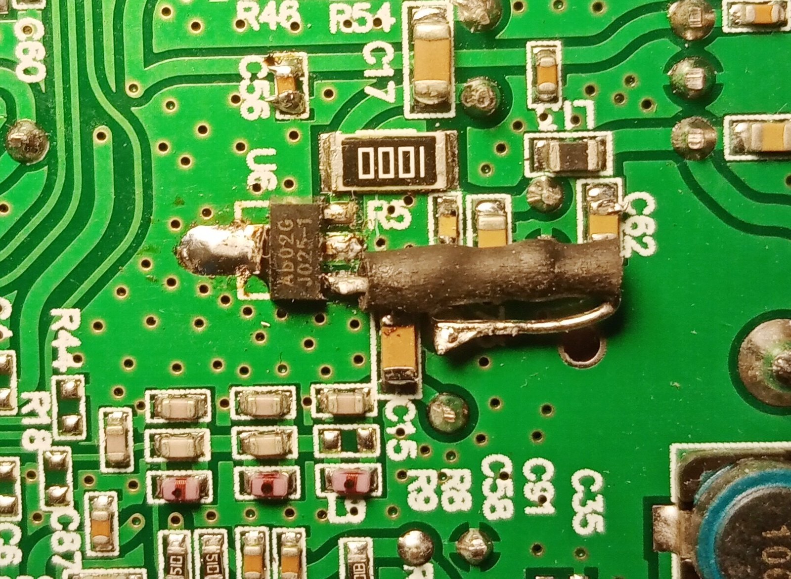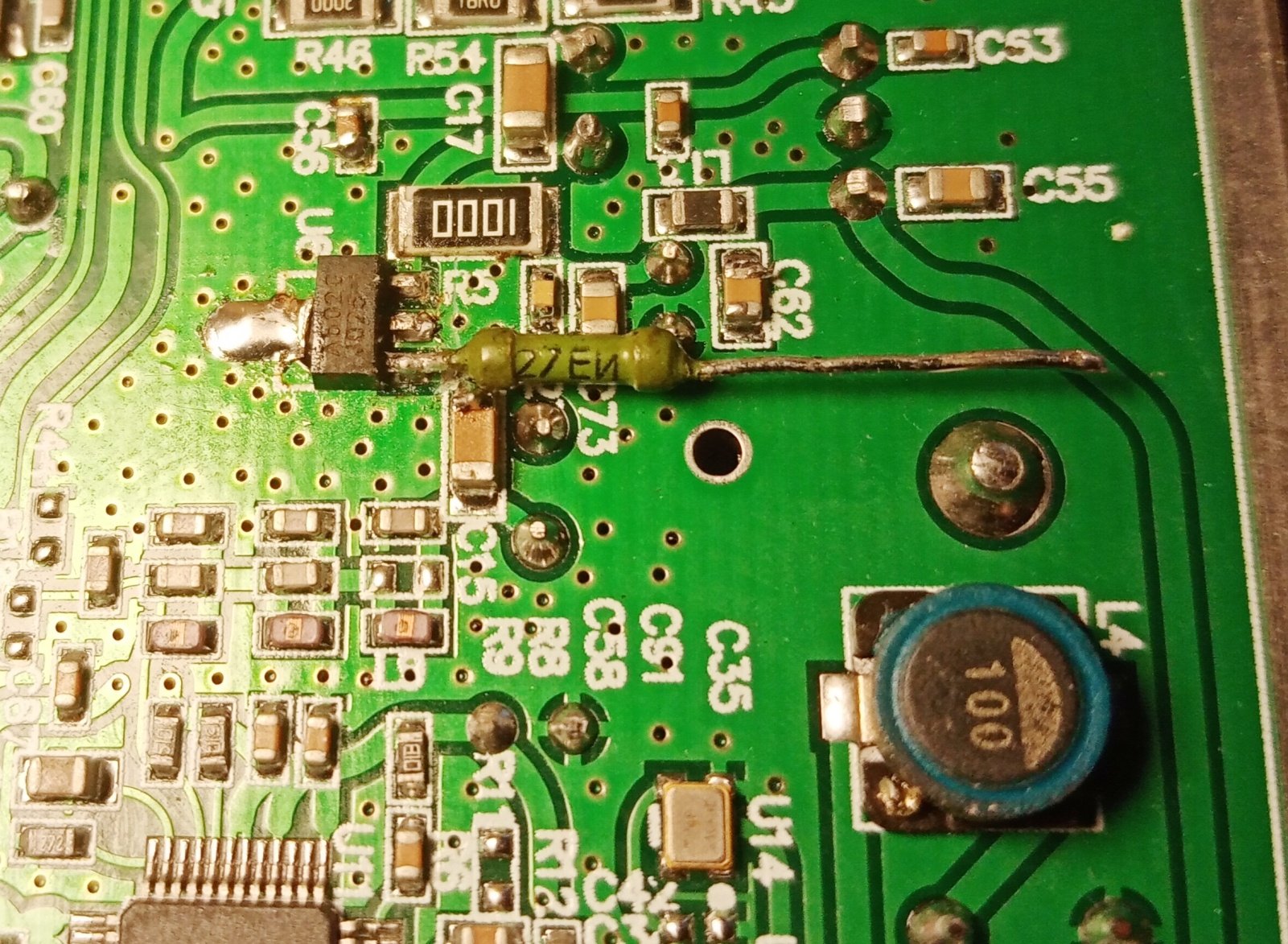 Для этого перерезаем дорожку и впаиваем SMD сопротивление 0805. Я поставил это сопротивление на торец (так как там мало места) и впаял без всяких удлинительных проводков.