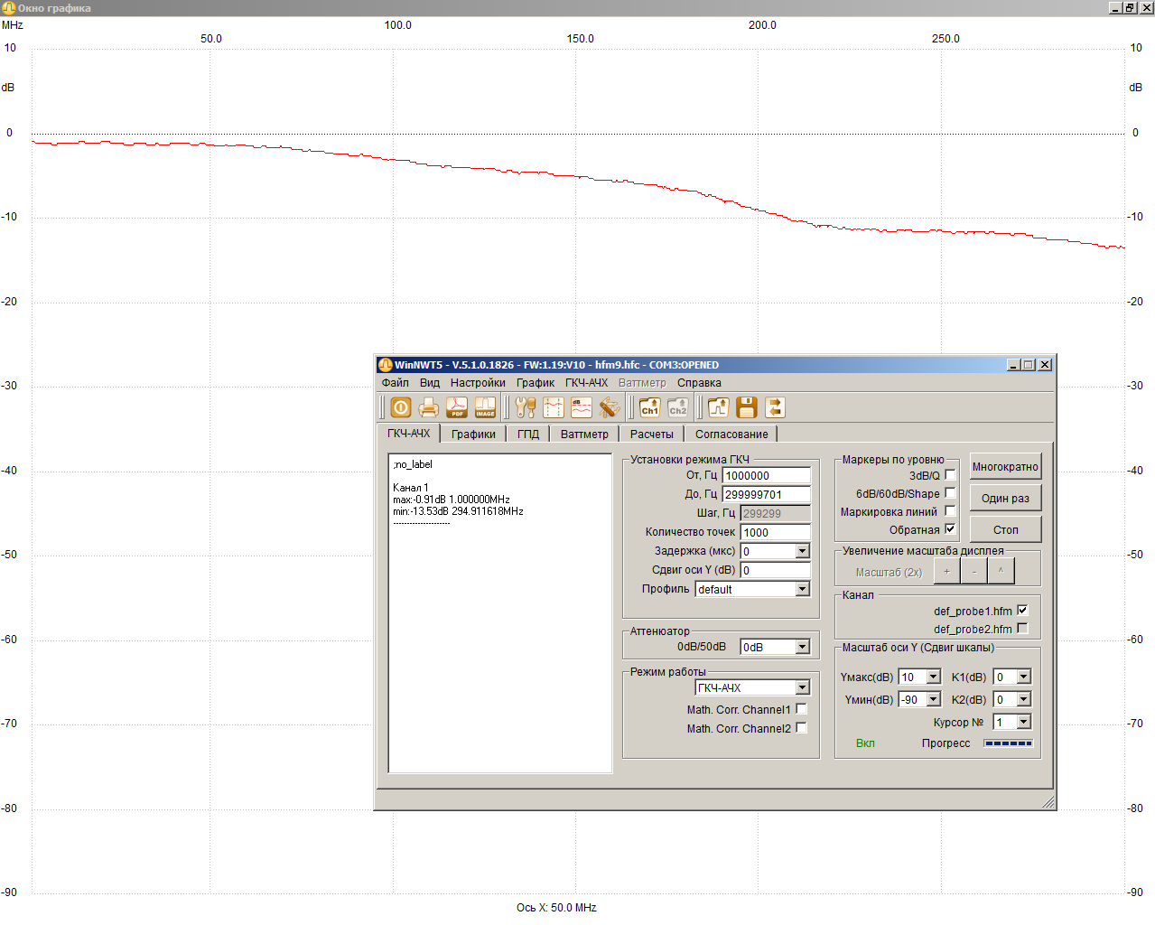 Прогнал до 50 МГц, надо калибровать. А я все свои калибровочные дела куда-то задевал... Может это кабели такие, а может длинноногий резистор вдоль земляной шины влияет.