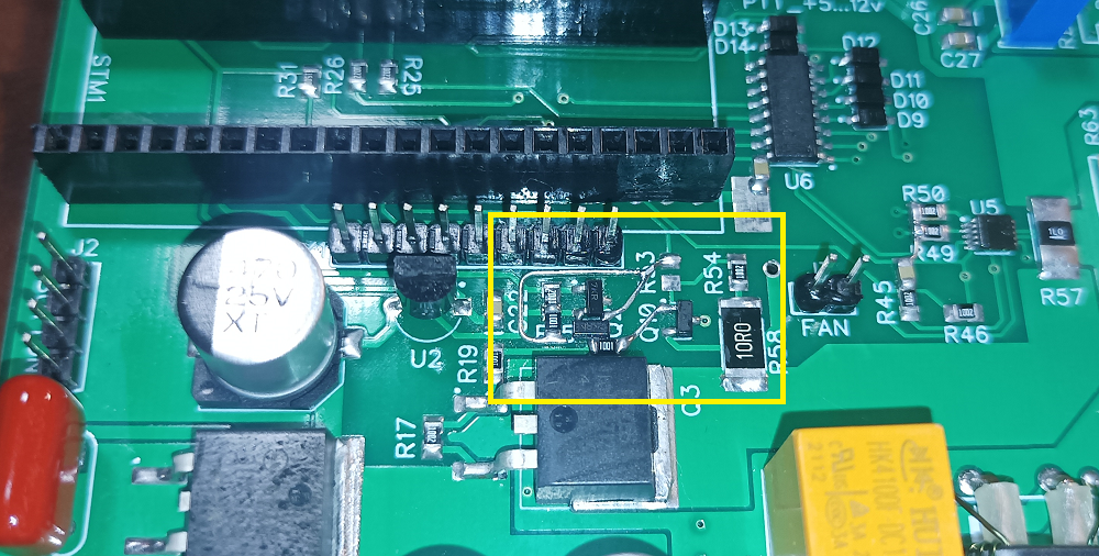 В схеме косяк с ключом управления вентилятором, ключ выполнен на полевичке IRLML2246, открывается замыканием на "землю", но я не учел один момент, что если сконфигурировать пин STM32 как open drain (открытый сток), то при отсутствии 0 на этом пине, там всегда висит +3,3v, т.е. пин не болтается в воздухе, в итоги IRLML всегда открыт и вентилятор охлаждения всегда работал, а +3,3v там всегда висито без нуля потому, что пин защищен внутри контроллера двумя диодиками к питанию и к "земле", вылечил добавлением еще одного ключика на 2N7002