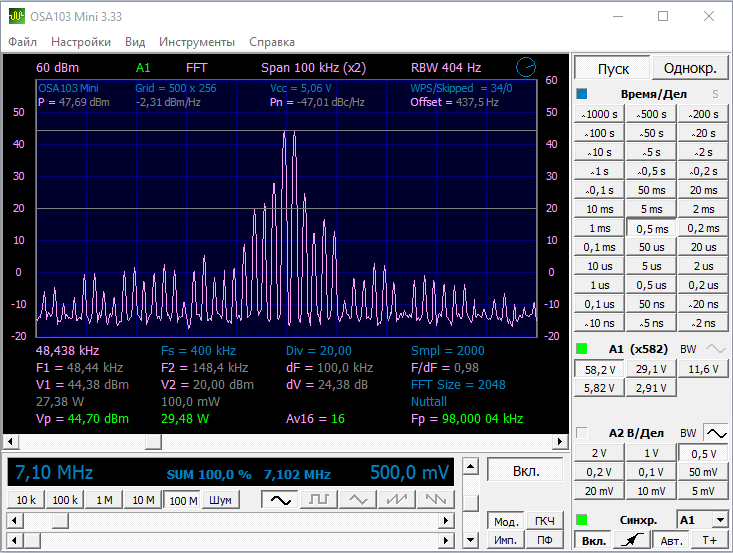 Что получилось "выдавить" из варианта усилителя с RD06HHF1 в предоконечнике. На НЧ до 70-100 ватт с ИМД не хуже -20dB от тонов двухтонового сигнала