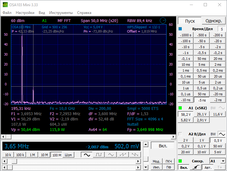 С моим степом 2 до 90 ватт на нч и до 60 ватт на ВЧ, можно и больше накрутить только ИМД будет плохой, а "гадить" в эфире не хочется, результаты измерений с АТТ -55,3dB после эквивалента
