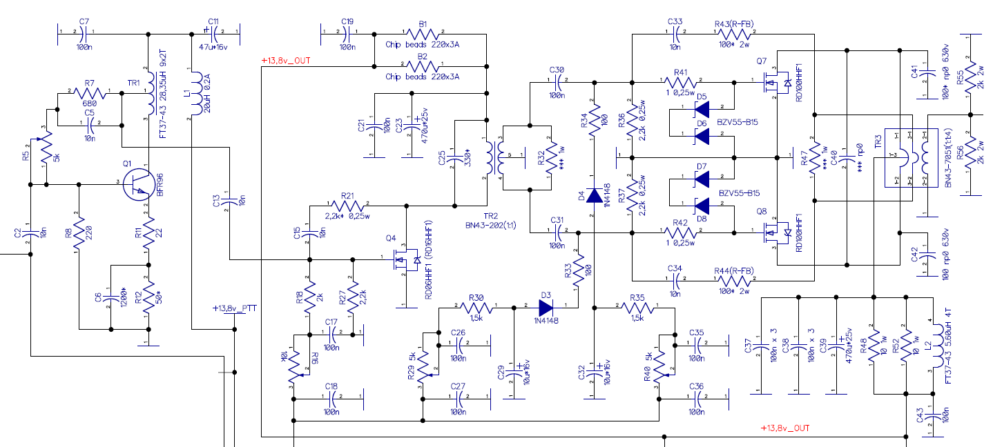 Трансформатор TR2 намотан 1:1 двумя косичками эмалированного провода диаметром 0,5мм по два витка, проводки в косичках соеденены последовательно конец-начало, центральный вывод вторички подсоединен на "землю" для симметрирования входа пары RD100HHF1