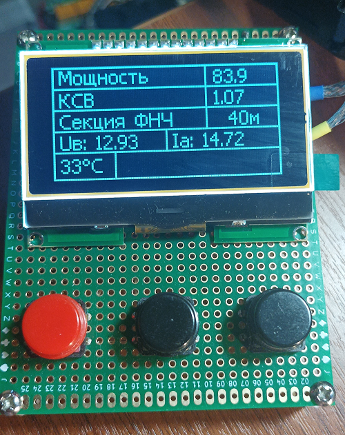 1. На дисплее в рабочем режиме показывает напряжение питания на каскадах усилителя, ток потребления каскадами усилителя, выходную мощность, КСВ, активную секцию ФНЧ, температуру радиатора, "градусник" выходной мощности.
