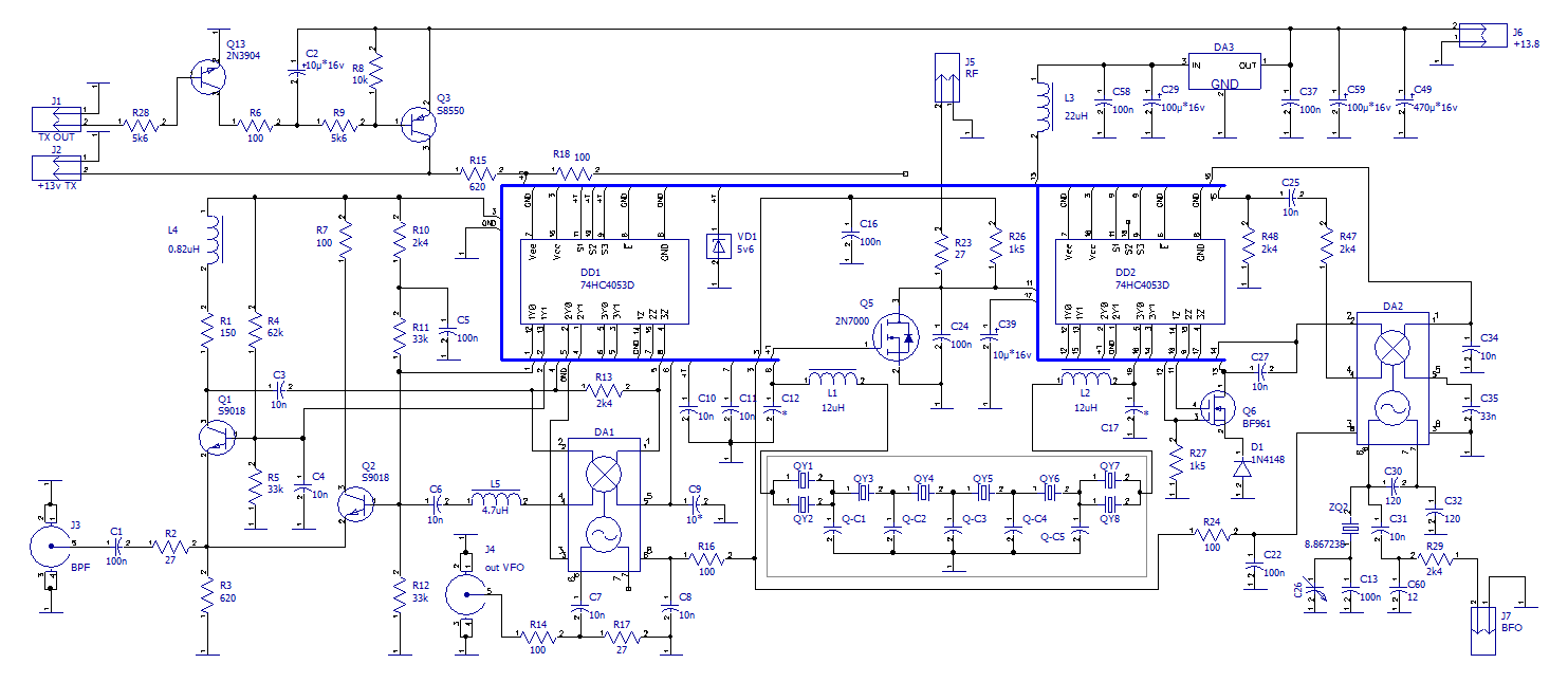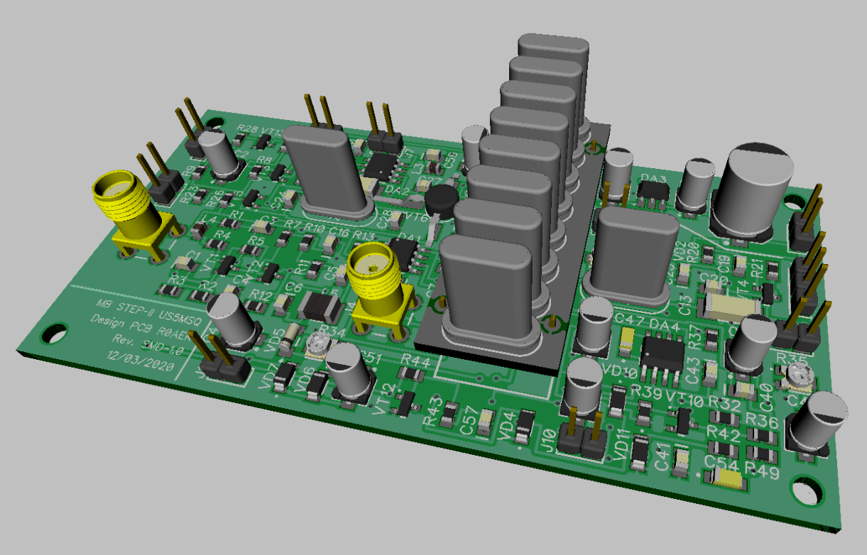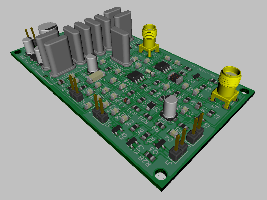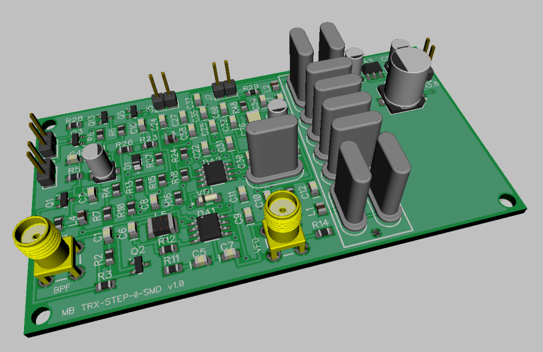 Вот как у меня получилось из отдельного проекта в DipTrace кварцевого фильтра сделать этот КФ отдельным компонентом и добавить на основную платку STEP-II в SMD. Размер платки получился 5*10см, монтаж плотненький. Компоновку компонентов делал разными блоками, не исключаю, что возможны и взаимовлияния блоков. Но это уже буду проверять на практике.