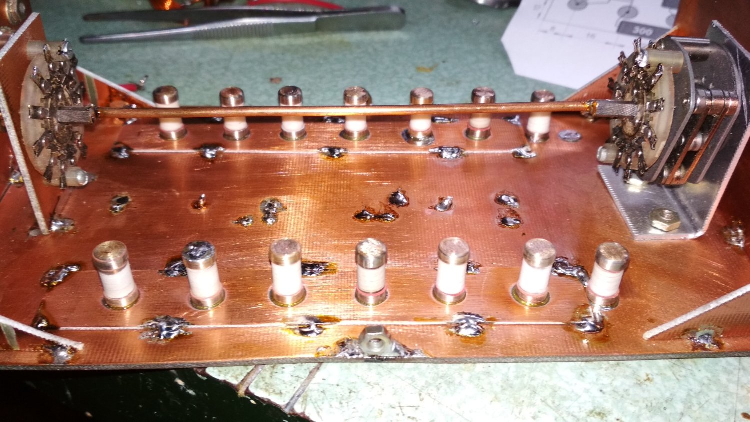 Монтаж выполнен на корпусах от резисторов МЛТ-1, конденсаторы КСО, катушки намотаны на ферритовых кольцах 20 мм типа 20ВН и 50ВН.